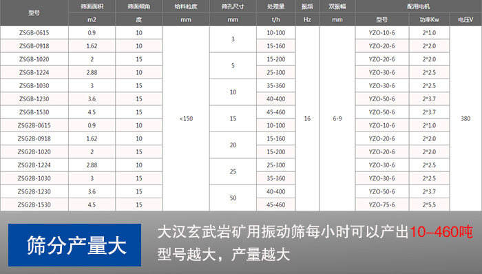 針對(duì)玄武巖篩分而言,篩分產(chǎn)量往往是放在一位的,大漢玄武巖礦用振動(dòng)篩每小時(shí)可以產(chǎn)出10-460噸的玄武巖成品,設(shè)備型號(hào)齊全,不同產(chǎn)量選擇的礦用振動(dòng)篩型號(hào)不同,產(chǎn)量越大,選擇的礦用振動(dòng)篩型號(hào)自然也是越大的。