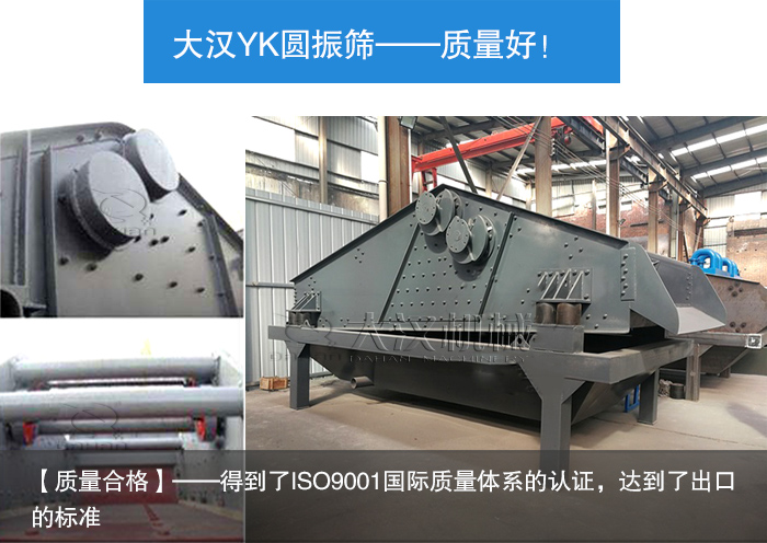 【質(zhì)量合格】——產(chǎn)品終都要回到使用這個因素上,所以只有質(zhì)量合格才能讓生產(chǎn)進行下去。大漢機械的YK圓振篩是嚴格按照國家生產(chǎn)標(biāo)準(zhǔn)生產(chǎn)的,經(jīng)久耐用,廣受好評,并且得到了ISO9001國際質(zhì)量體系的認證,達到了出口的標(biāo)準(zhǔn)。